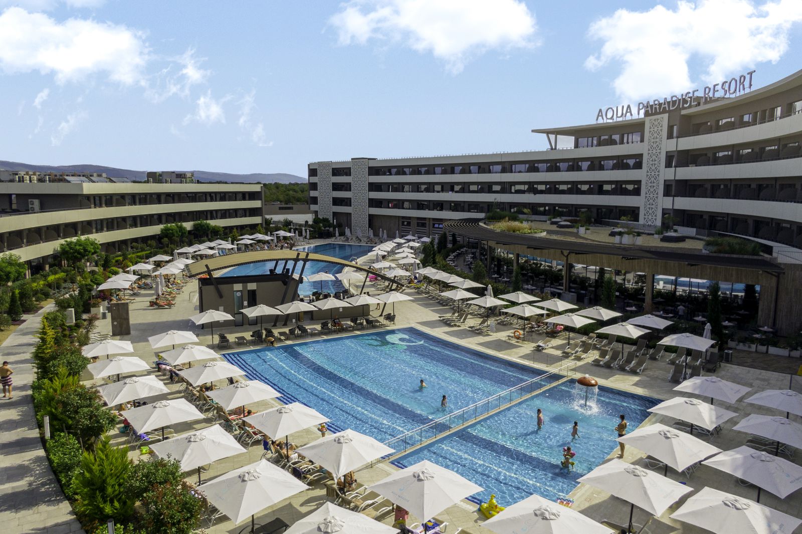 Direct naar: * Ligging () * Faciliteiten () * Restaurants&Bars () * Hotelkamers () * Sport&Ontspanning () * Kinderfaciliteiten () * Zwembaden () * Verzorging () Ligging: Aqua Paradise Resort * Op ca. 650 meter van het zandstrand * Op ca. 3 kilometer van Nessebar * Bushalte op ca. 1 kilometer * Winkels en restaurants op ca. 1 kilometer * Tegen betaling een shuttleservice naar Nessebar Faciliteiten * 3 gebouwen met maximaal 6 verdiepingen * In elk gebouw is een lift aanwezig * 434 kamers * 24-uursreceptie * Bagageruimte * Lobby * Tuin * Gratis wifi in de lobby * Winkeltjes en minimarkt* * Wasservice* * Doktersservice* * Privé parkeerterrein *Tegen betaling Restaurants&bars * 1 buffetrestaurant * 1 Italiaans buffetrestaurant (vooraf reserveren) * 1à-la-carterestaurant (vooraf reserveren) * 6 bars Hotelkamers * Standaardkamer (1-3 personen) * Ca. 27-28 m² * Gelegen in het bijgebouw * Telefoon* * Airconditionig * Televisie * Koelkastje* * Kluisje * Koffie-/theezetfaciliteiten op aanvraag * Wifi * Inloopdouche * Toilet * Föhn * Balkon of terras met zitje *Tegen betaling * Superiorkamer (2-4 personen) * Ca. 32-35 m² * Gelegen in het hoofdgebouw * Dezelfde faciliteiten als de standaardkamer * Familiekamer (min. 3 pers. en max. 4 volw. + 2 kind.) * Ca. 56-62 m² * Bestaat uit een woon-/slaapkamer, 2 slaapkamers en 2 badkamers * Dezelfde faciliteiten als de standaardkamer Sport&Ontspanning * Fitness * Basketbal * Volleybal * Darts* * Minivoetbal * Tafelvoetbal* * Biljart* * Tafeltennis* * Tennis* * Bowlen* * Gameroom* * Watersporten aan het strand* * Turks bad* * Sauna * Binnenzwembad * bubbelbad * Massages en behandelingen* * Dagelijks entertainment *Tegen betaling Kinderfaciliteiten * 2 kinderbaden * 1 binnen kinderbad * Gratis toegang tot het naastgelegen Aquapark (volledig open vanaf 12-05 t/m 27-09 waarbij de attracties roulerend, op vastgestelde tijden geopend zijn) * Miniclub 6 dagen per week (4-12 jaar) * Minidisco 6 dagen per week * Speeltuintje Zwembaden&Strand * 3 buitenzwembaden * 1 binnenzwembad * Zonneterras met gratis ligbedden en parasols * Gratis badhanddoekenservice * Gratis toegang tot het naastgelegen Aquapark (volledig open vanaf 12-05 t/m 27-09 waarbij de attracties roulerend, op vastgestelde tijden geopend zijn) * Ligbedden en parasols op het strand zijn tegen betaling Verzorging Zomer: Aqua Paradise Resort * Verblijf o.b.v. All Inclusive: * Ontbijt in buffetvorm (07.30-10.00 uur) * Lunch in buffetvorm (12.30-14.30 uur) * Diner in buffetvorm (18.30-21.30 uur) * Snacks (10.00-17.30 uur) * Bij een verblijf van minimaal 6 dagen kun je 1 maal dineren in het Italiaans buffetrestaurant (vooraf reserveren) * Bij een verblijf van minimaal 6 dagen kun je 1 maal dineren in hetà-la-carterestaurant (vooraf reserveren) * Alle door het hotel geselecteerde lokale alcoholische en alcoholvrije drankjes van 10.00 tot 23.00 uur