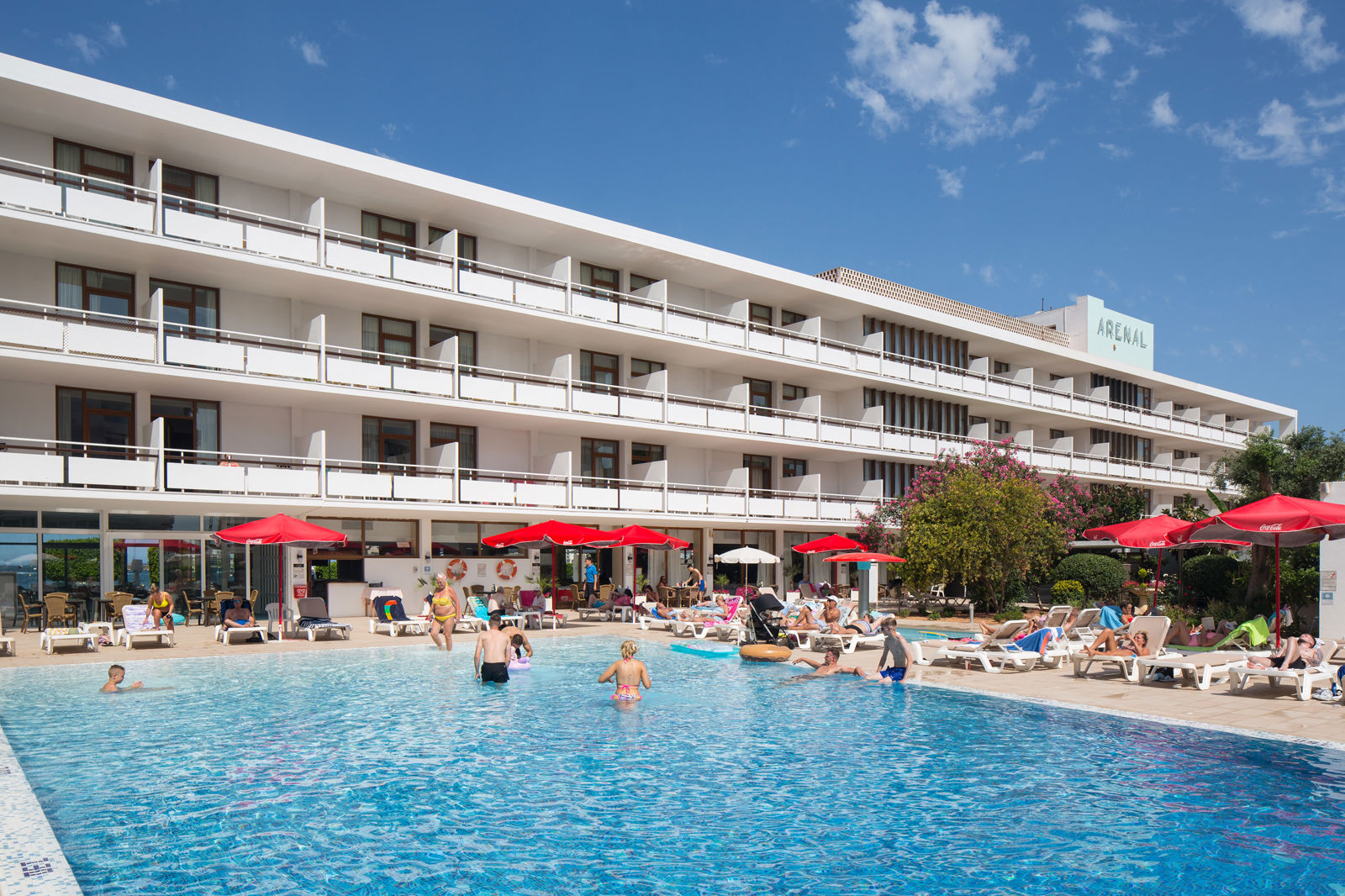 Direct naar: * Ligging () * Faciliteiten () * Restaurants&Bars () * Hotelkamers () * Sport&Ontspanning () * Kinderfaciliteiten () * Zwembaden&Strand () * Verzorging () Ligging: Arenal Hotel * Het openbare zandstrand op ca. 10 meter, gescheiden door een promenade * Op ca. 500 meter van San Antonio * Ibiza-Stad op ca. 16 kilometer * Santa Eulalia op ca. 24 kilometer * Bushalte op korte loopafstand * Winkels, restaurants en bars in de directe omgeving * De haven is op loopafstand Faciliteiten * 1 gebouw met 3 verdiepingen * 1 lift * 131 kamers * 24-uursreceptie * Lobby * Tuin * Wifi* * Parkeerterrein *Tegen betaling Restaurants&bars * 1 restaurant * 1 snackbar * 1 bar Hotelkamers * Standaardkamer (1-3 personen) * Airconditioning * Satelliettelevisie * Kluisje* * Bad/douche * Toilet * Balkon of terras (alleen voor 2-3 personen) * Tegen een meerprijs te boeken met zeezicht (2-3 personen) *Tegen betaling Sport&Ontspanning * Tafeltennis * Biljart* * Fitness * Sauna* * Watersporten aan het strand* * Bij goed weer en genoeg animo worden er avondshows georganiseerd *Tegen betaling Kinderfaciliteiten * 1 kinderzwembad * Speeltuintje Zwembaden&Strand * 1 buitenzwembad * 1 binnenzwembad * Zonneterras met gratis ligbedden, matrasjes en parasols * Ligbedden en parasols op het strand tegen betaling * Verzorging Zomer : Arenal Hotel * Verblijf o.b.v. Logies * Tegen een meerprijs verblijf je o.b.v. Logies&Ontbijt * Tegen een meerprijs verblijf je o.b.v. Halfpension: * Ontbijt en diner